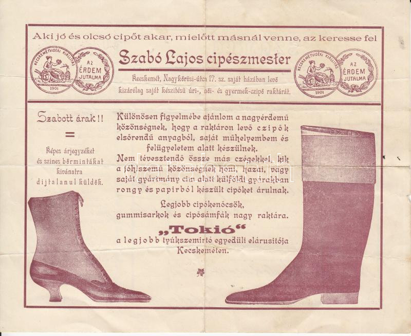 1912 Kecskemét, Szabó Lajos cipészmester által lovaglócsizmáért kiállí... https://www.darabanth.com/de/229-Fernauktion/229.0/Andere-Sammelgebiete/Dokument~400432/1912-Kecskemet-Szabo-Lajos-cipeszmester-altal-lovaglocsizmaert-kiallitott-diszes-fejlece~II1026254