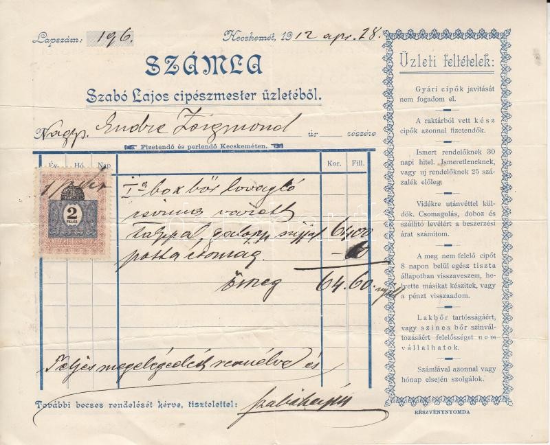 Beschreibung: 1912 Kecskemét, Szabó Lajos cipészmester által lovaglócsizmáért kiállított díszes fejléces számla 2f okmánybélyeggel