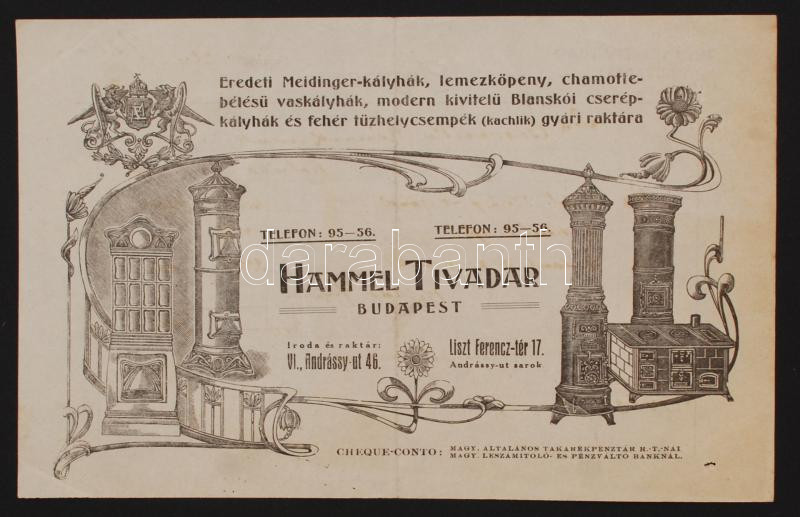 1922 Bp.VI., Hammel Tivadar kályhák, kályha- és tűzhelycsempék raktárá... https://www.darabanth.com/de/229-Fernauktion/229.0/Andere-Sammelgebiete/Dokument~400432/1922-BpVI-Hammel-Tivadar-kalyhak-kalyha-es-tuzhelycsempek-raktaranak-diszes-fejleces-~II1026480