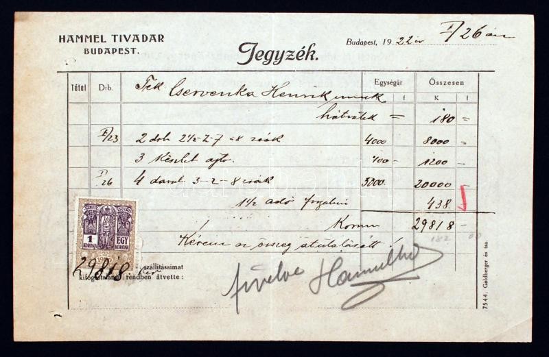 Beschreibung: 1922 Bp.VI., Hammel Tivadar kályhák, kályha- és tűzhelycsempék raktárának díszes fejléces számlája 1 korona okmánybélyeggel