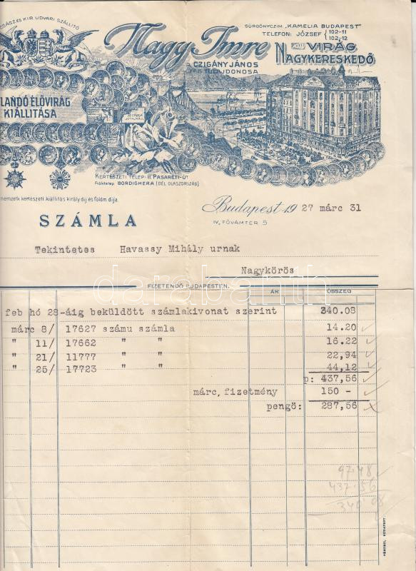 1927 Bp.IV. Fővám tér, Nagy Imre Virágnagykereskedő által kiállított d... https://www.darabanth.com/de/229-Fernauktion/229.0/Andere-Sammelgebiete/Dokument~400432/1927-BpIV-Fovam-ter-Nagy-Imre-Viragnagykereskedo-altal-kiallitott-diszes-fejleces-szam~II1026321