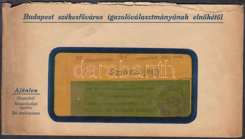 Beschreibung: 1930 Budapest Székesfőváros törvényhatósági választására szóló szavazójegyek borítékban, pecséttel