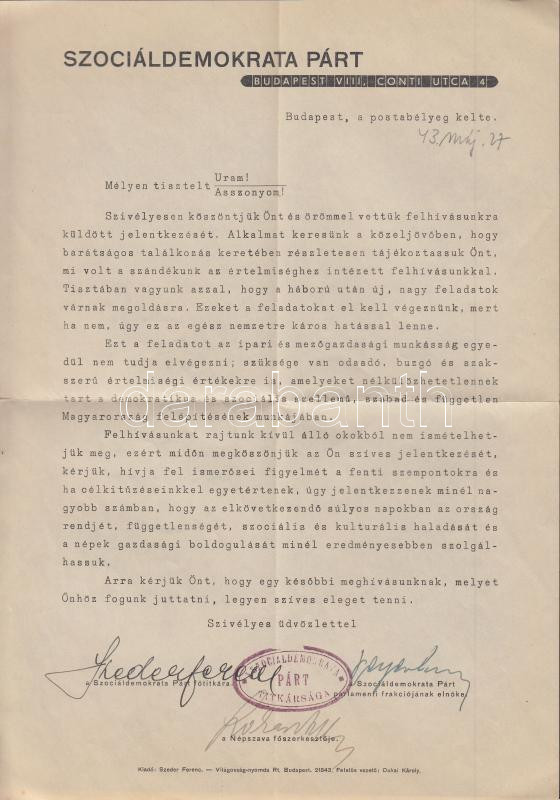 1943 Bp., A Szociáldemokrata Párt válaszlevele a felhívásukra érkezett jelentkezésre, a párt pecsétjével, Szeder Ferenc főtitkár, a Népszava szerkesztőjének aláírásával