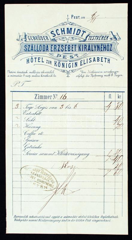 Beschreibung: cca 1880 Budapest V. A Szálloda Erzsébet királynéhoz fejléces számlája