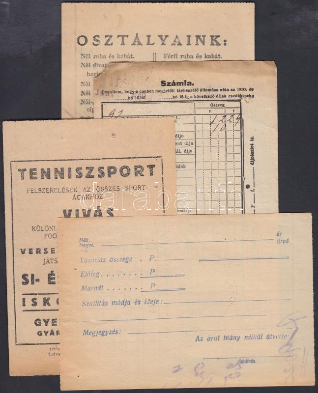 Beschreibung: cca 1929-1941 Üzleti blokkok, számlák (Bodográf fa- és szénlerakat, Fenyves áruház, Corvin, Lopos Gyula Sport- és Játéküzlete, Spielberger Armin stb.)