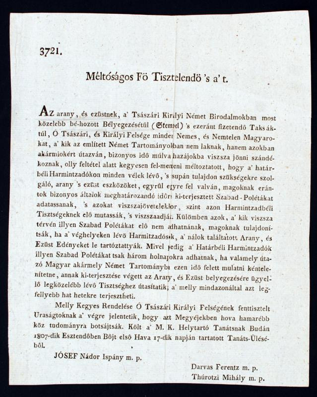 1807 Buda, Helytartótanácsi rendelet a magyarok arany és ezüst behozatala esetén bélyegzés és adó(vám) megfizetése alól való felmentéséről és további utasításokról