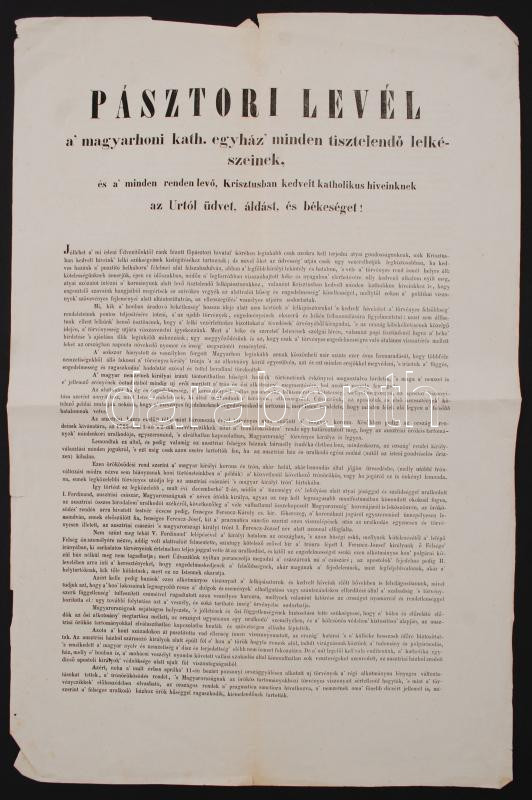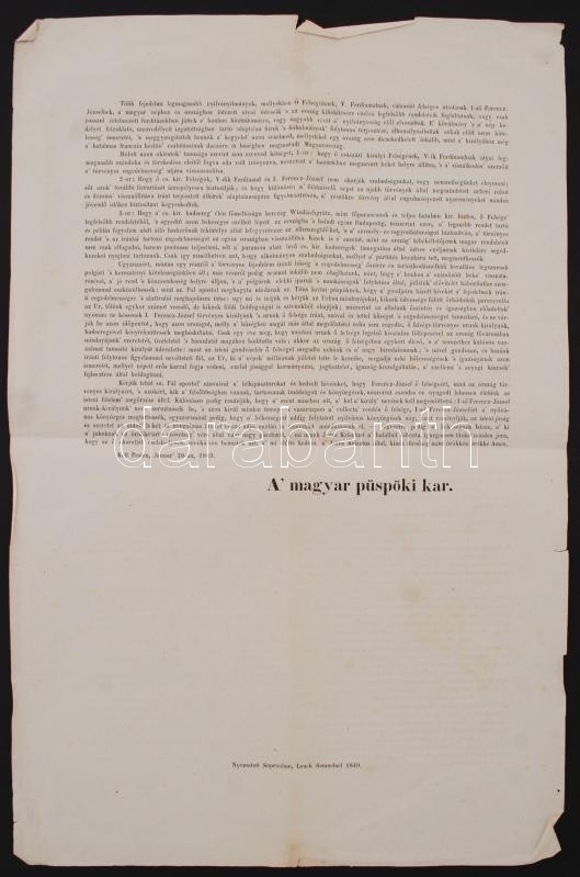 1849 Pest, A magyar püspöki kar levele a magyarhoni katolikus egyház lelkészeihez, melyben elismerik Ferenc Józsefet törvényes uralkodónak, és kiadják lelkipásztoraiknak az udvar hűségére való visszatérést és visszatérítést, 29x45 cm