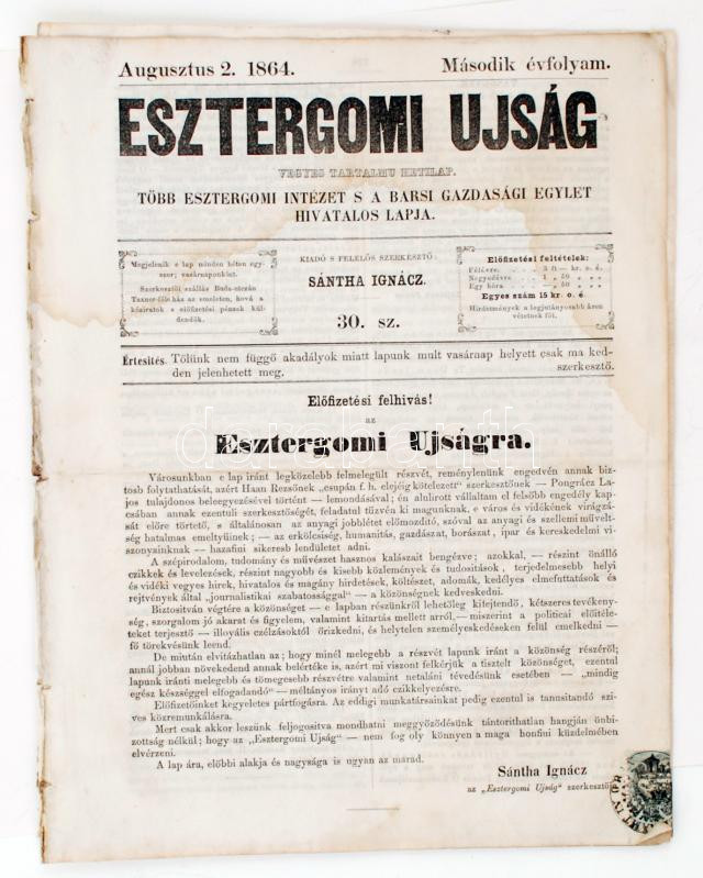 1864 az Esztergomi újság, a Barsi Gazdasági Egylet és más esztergomi intézetek hetilapja második évfolyamának két száma (augusztus 2., október 23.), helyenként foltos, egyébként jó állapotban.