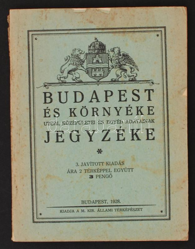 1928 Budapest és környéke utcái, középületei és egyéb adatainak jegyzéke. 3. javított kiadás. Térkép nélkül. Budapest, 1928, M. Kir. Állami Térképészet.