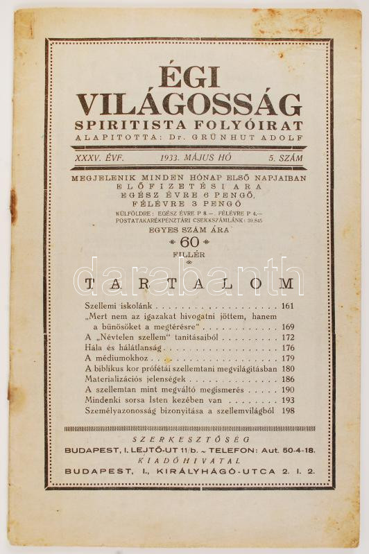 1933 Égi világosság spiritista folyóirat egy lapszáma (XXXV. évf. 5. s... https://www.darabanth.com/de/229-Fernauktion/229.0/Andere-Sammelgebiete/Drucksachen~8/1933-Egi-vilagossag-spiritista-folyoirat-egy-lapszama-XXXV-evf-5-sz-1933-majus-valto~II965021