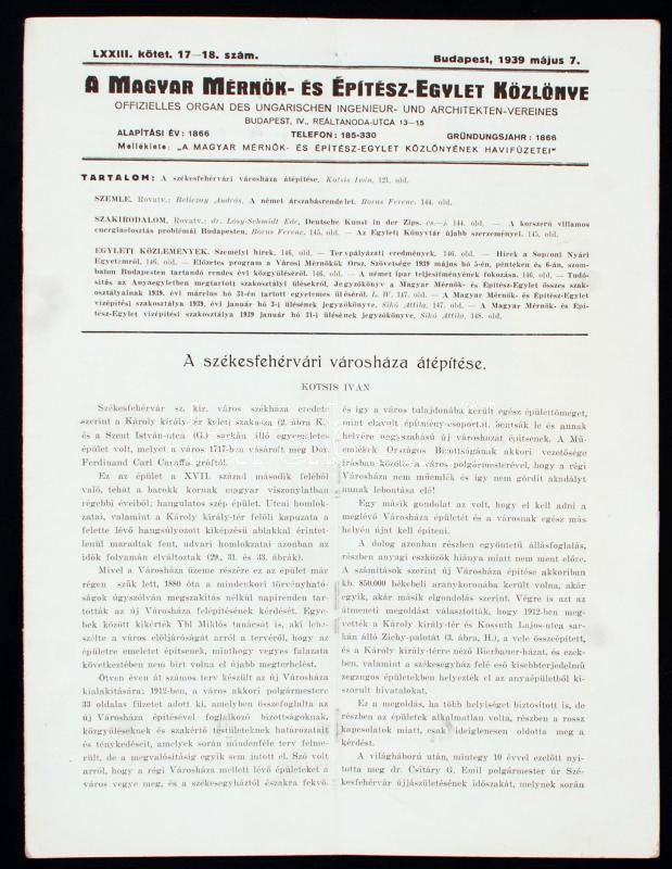 1939 Bp., A Magyar Mérnök- és Építész-Egylet Közlönye, benne Székesfeh... https://www.darabanth.com/de/229-Fernauktion/229.0/Andere-Sammelgebiete/Drucksachen~8/1939-Bp-A-Magyar-Mernok-es-Epitesz-Egylet-Kozlonye-benne-Szekesfehervar-epiteszetC3~II1023623