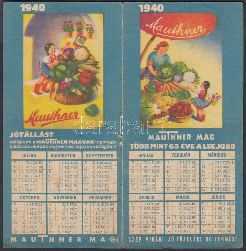Beschreibung: 1940 "Szép Virág! Jó főzelék! Bő termés!" Mauthner Ödön-féle magkereskedés színes kártyanaptára