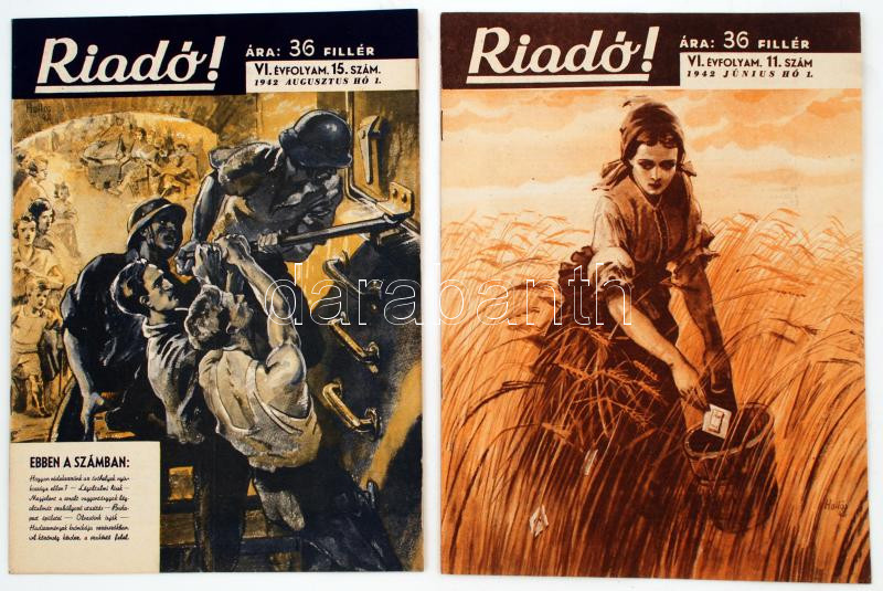1942 Riadó! A Légoltalmi Liga Lapjának VI. évfolyam 11. és 15. száma, benne beszámolóval a Liga országos közgyűléséről, jótanácsokkal az óvóhelyek nyirkosságának elkerülésére stb.