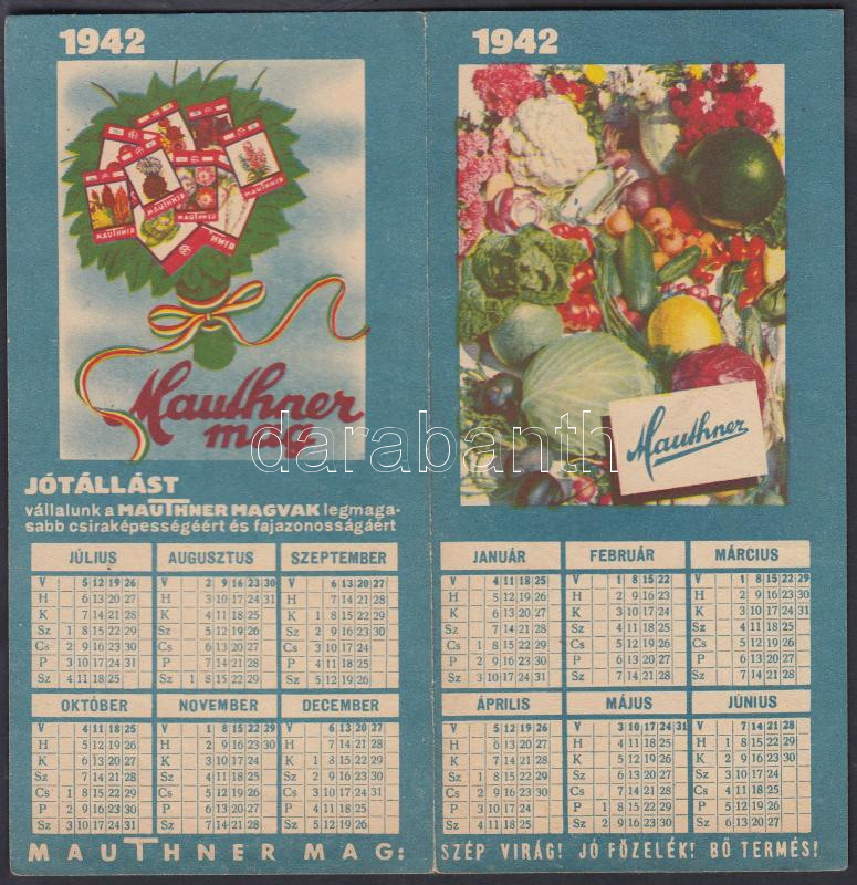 Beschreibung: 1942 "Szép Virág! Jó főzelék! Bő termés!" Mauthner Ödön-féle magkereskedés színes kártyanaptára