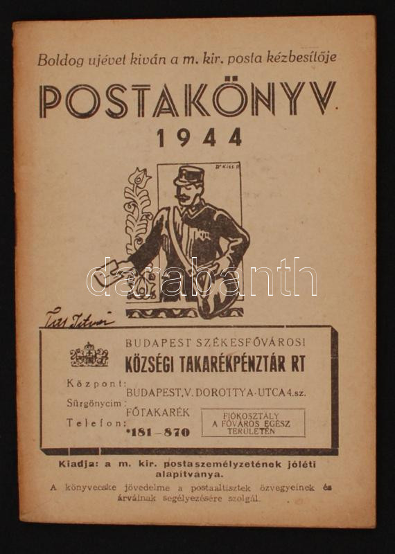 1944 A Magyar Királyi Posta postakönyve a levél- és csomagküldésről szóló fontos információkkal, reklámokkal(pl. Crovin Áruház, Tungsram, Chinoin, Orion Rádió stb.), 32p