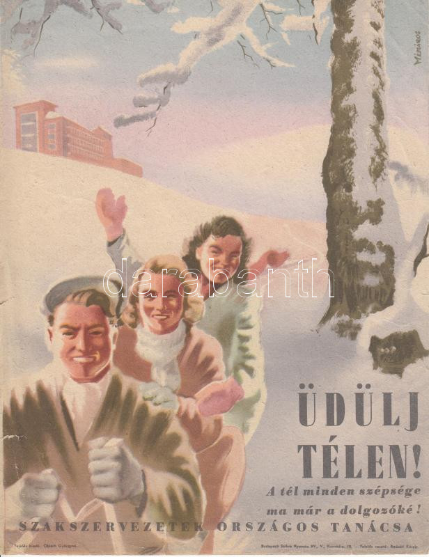 1949 Üdülj télen! A tél minden szépsége ma már a dolgozóké! A Szakszervezetek Országos Tanácsa propagandaplakátja, Bp., Szikra Nyomda, "Mészáros" jelzéssel, kis szakadással, 24×17 cm