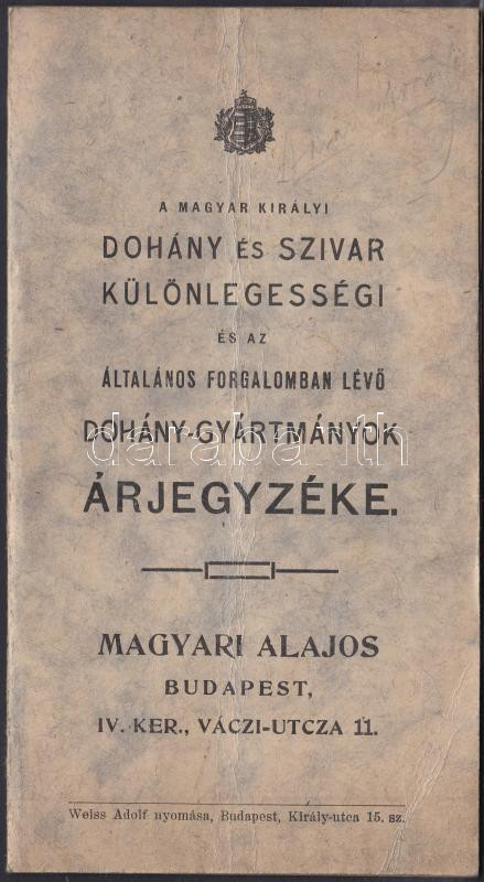 Beschreibung: cca 1900-1910 Bp. IV., A Magyar Királyi Dohány és Szivar különlegességei és az általános forgalomban lévő dohánygyártmányok árjegyzéke, 20p