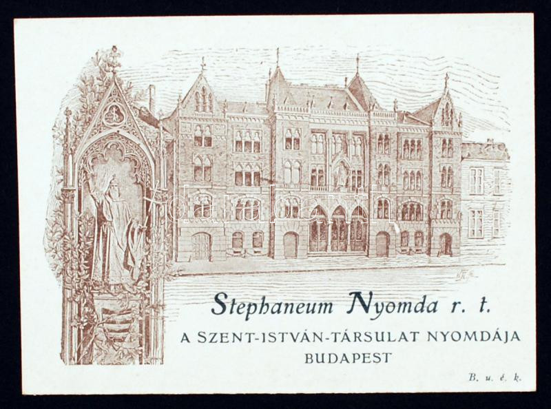 Beschreibung: cca 1920 Bp. VIII. Szenkirályi utca 28.(ma a PPKE épülete), A Stephaneum Nyomda R.T., a Szent-István-Társulat Nyomdájának újévi üdvözlőkártyája