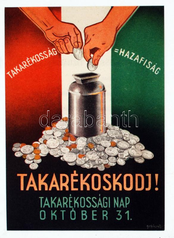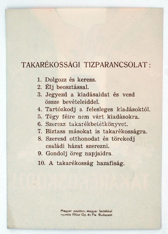 cca 1930-1940 "Takarékoskodj! Takarékosság=Hazafiasság" A takarékossági napot népszerűsítő kisméretű szórólap, hátoldalán takarékossági tízparancsolattal, 10x13 cm