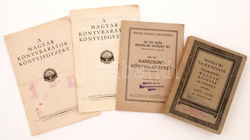 cca 1937-1946 Irodalommal kapcsolatos tétel-Az Új Idők Irodalmi Intézet Rt. karácsonyi könyvárjegyzéke, A Magyar Könyvbarátok könyvjegyzéke(2 db), Irodalmi tájékoztató válogatott magyar könyvek jegyzéke, összesen: 4 db