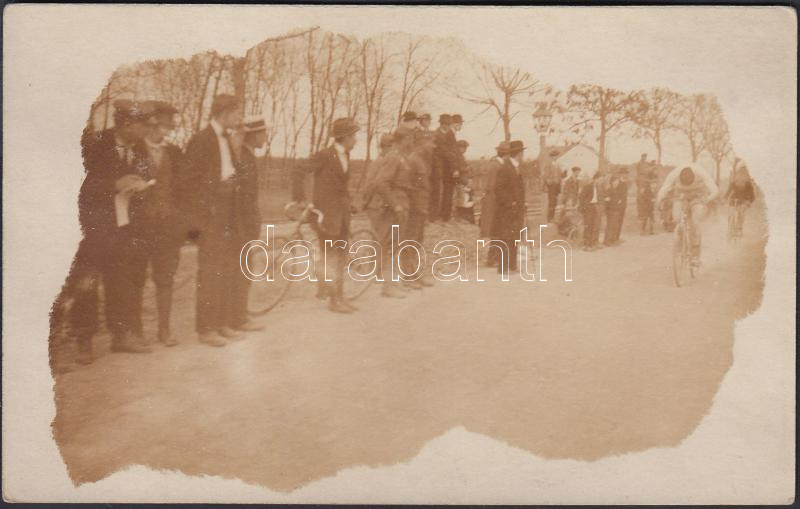 Beschreibung: 1918. április 27. Mazák Kálmán a 30 km-es junior kerékpárverseny győztese a végső hajrában, feliratozott vintage fotólap, 9x14 cm