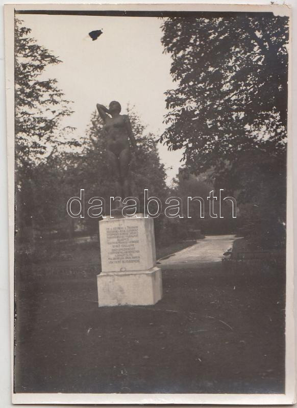 1932 A magyar fájdalom szobra Budapesten, a Szabadság téren, a rajta levő szöveg jól olvasható: Ez a szobor a trianoni szerződés által elrabolt gyermekei sorsát sirató Magyarország fájdalmát jelképezi… Emile Guillaume (1867-1942) alkotása, 9x6,5 cm