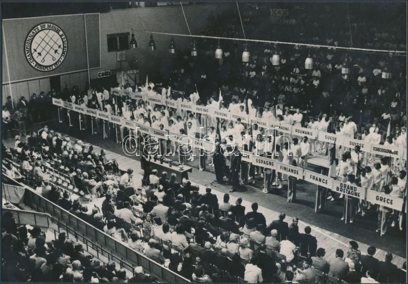Beschreibung: 1975 Vívó világbajnokság megnyitó ünnepsége Budapesten, amelyen 39 ország sportolói vettek részt, 16,5x23,5 cm