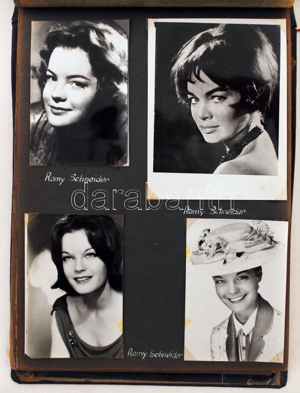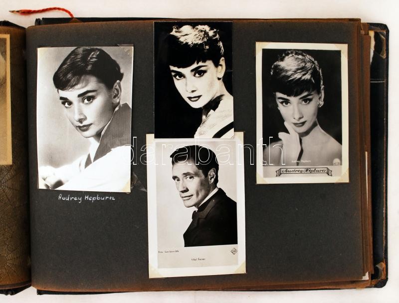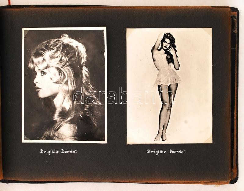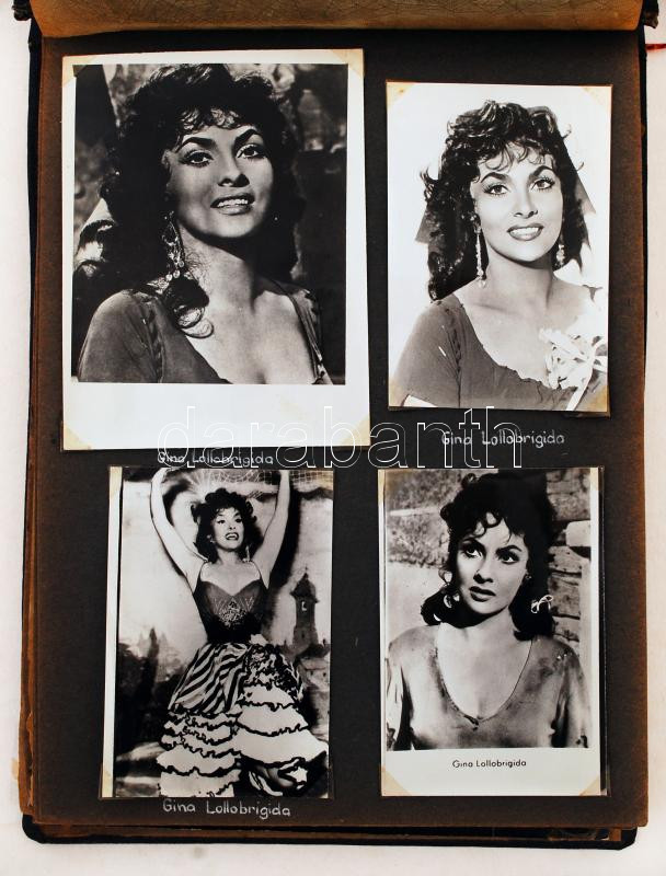 Vegyes fotó gyűjtemény, híres, külföldi színészekről albumba rendezve, több, mint 150 db, (Sophia Loren, Brigitte Bardot, Alain Delon, Errol Flynn, Gerard Philipe, Jeam Maris, Romy Schneider, Belmondo,stb.) ebből 2 aláírt: Gina Lollobrigida, Jose Suarez.
