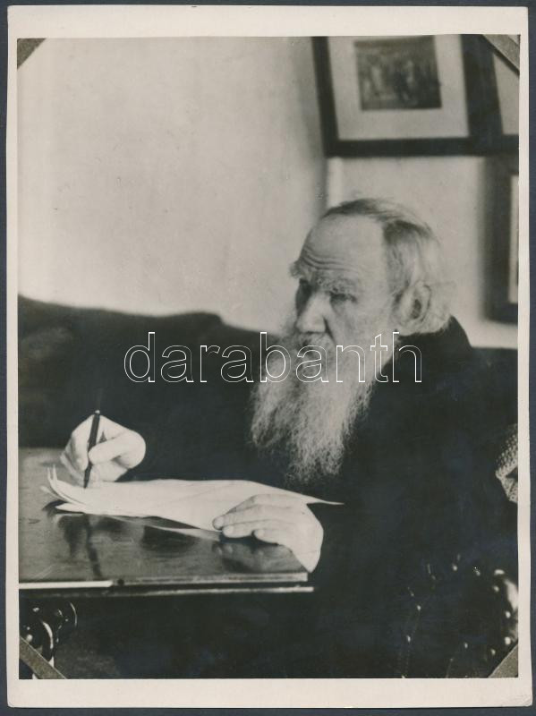 cca 1905 Tolsztoj (1828-1910) orosz író időskori portréja a Sojusfoto archívumából, 1941-ben azért közli a sajtó, mert Tolsztoj életéről filmet forgattak Oroszországban, pecsétek, feliratok a hátoldalon, 22x17 cm