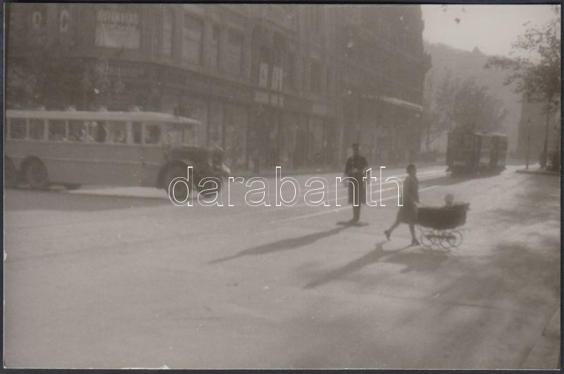 Beschreibung: cca 1930 Budapest, talán az I. ker., Krisztina körúton autóbusz, villamos és közlekedést irányító rendőr, korabeli negatívról későbbi fotólap, 9x14 cm