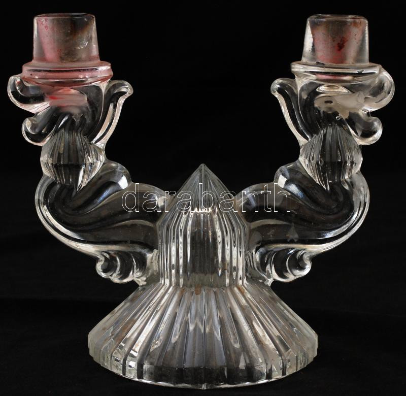 Beschreibung: Kétkaros díszes üveg gyertyatartó, jelzés nélkül, viasznyomokkal, m: 19 cm