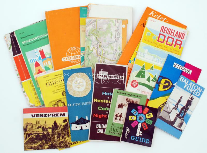 cca 1960-1980 Vegyes térkép tétel: 10 db térkép: NSzK és Nyugat-Berlin autótérképe, Kelet-Európa autótérképe, Svájc, az NDK látnivalói, Drezda, stb. + 6 db információs prospektus különféle magyar városokról (Balatonszentgyörgy, Veszprém, Balatonfüred, stb.), példányonként változó, nagyrészt jó állapotban, néhány darab szakadozott, vagy hiányos