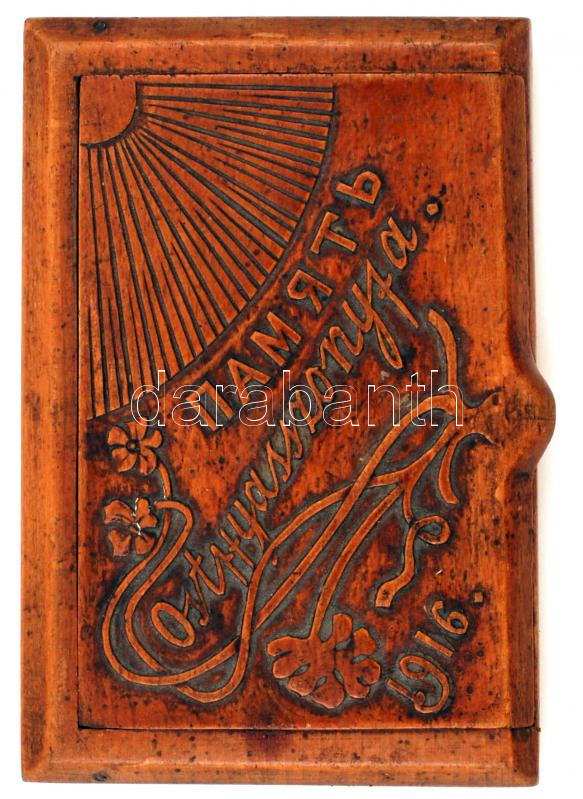 1916 Fából készült díszes fedelű fa cigarettatárca, részben orosz nyelvű felirattal, emlék az ostffyasszonyfai fogolytáborból, benne 8 db sodort, megtömött Bajtárs illetve Symphonia márkájú cigarettával /