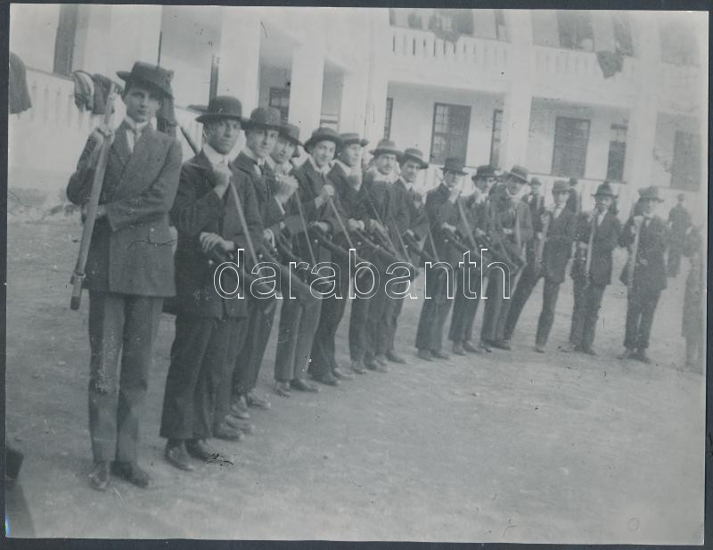 Beschreibung: cca 1910 Bevonuló fiatalok civilben és már beöltözve katonának, 2 db korabeli negatívról készült későbbi másolatok, 18x24 cm