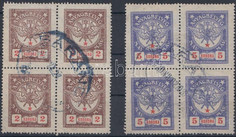 Beschreibung: 1920 MÁV 2K és 5K anyagbélyeg négyestömbök "BÁRÁND"