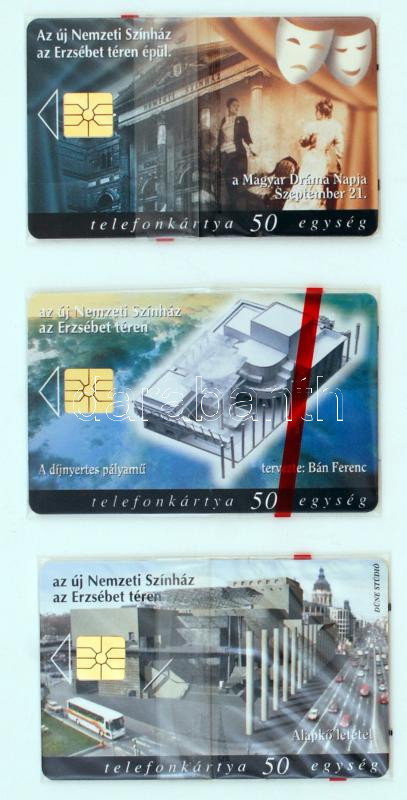 Beschreibung: 1997 Új Nemzeti Színház épül az Erzsébet téren, látványtervezetekkel díszített telefonkártyák bontatlan csomagolásban, 3 db