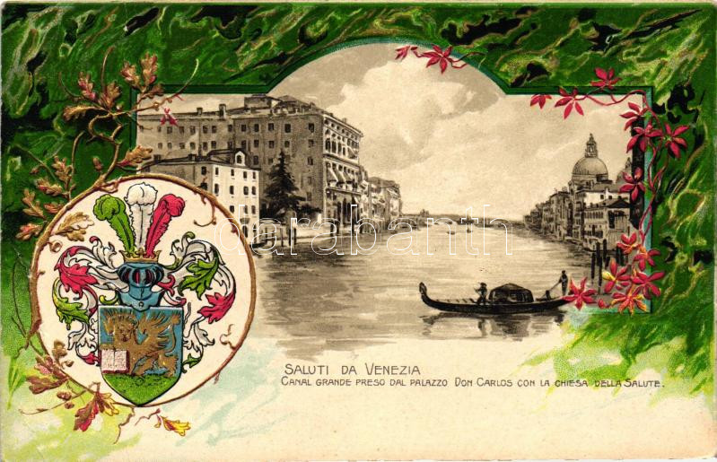 Beschreibung: Venice, Venezia; Canal Grande preso sal palazzo Don Carlos con la chiesa della salute / palace, church, coat of arms, Emb. litho (small tear)
