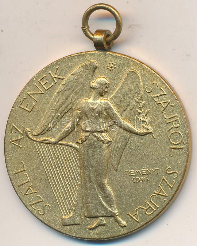 Reményi József (1887-1977) 1940. "Száll az Ének Szájról Szájra / A Magyar Dalos Egyesületek Országos Szövetsége" aranyozott Br díjérem szalaggal (36mm) T:2