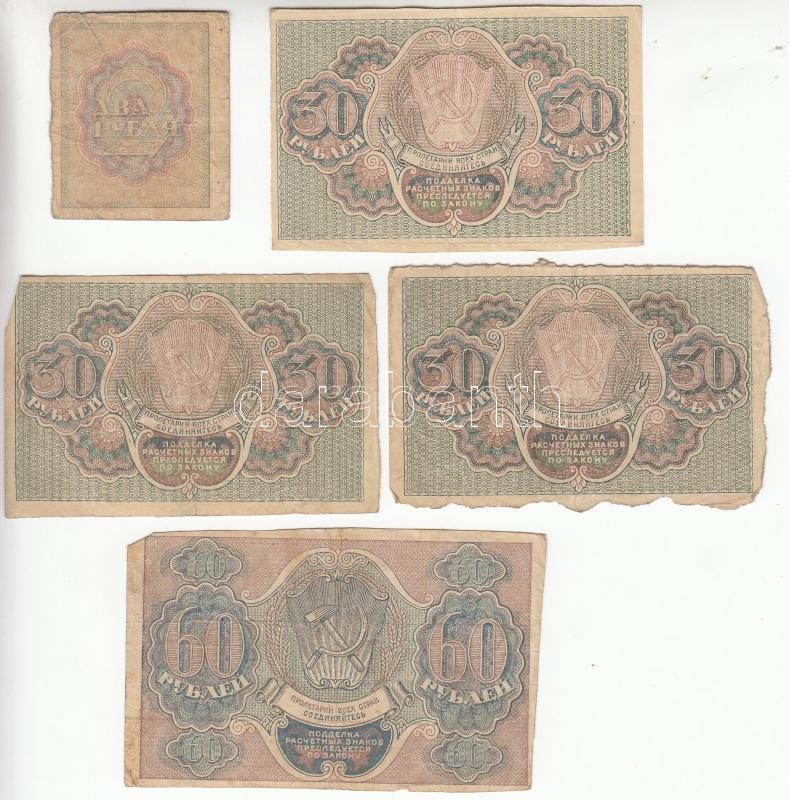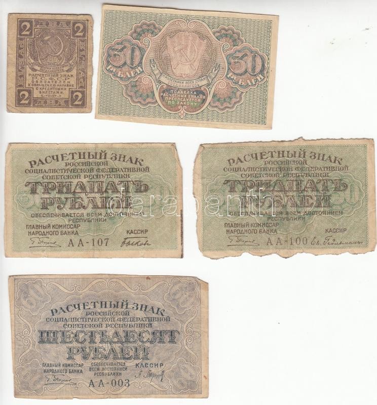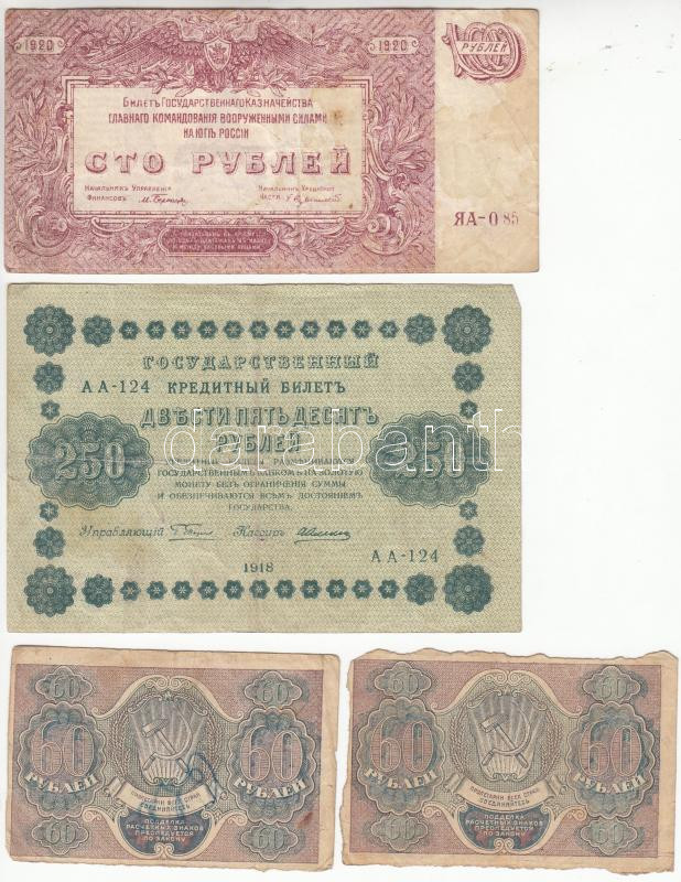 Beschreibung: Orosz Birodalom 1918. 250R + Szocialista Szövetségi Szovjet Köztársaság 1919. 2R + 30R (3x) + 60R (3x) + Dél-Oroszország / Gyenyikin és Vrangel Hadserege 1920. 100R T:vegyes