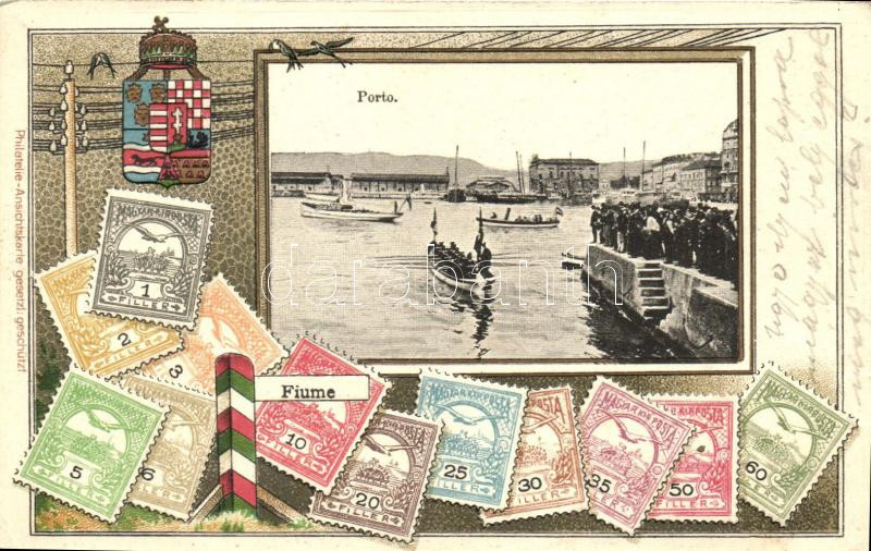 Beschreibung: Fiume, Porto, Philatelie-Ansichtskarte, stamps, coat of arms litho (EK)