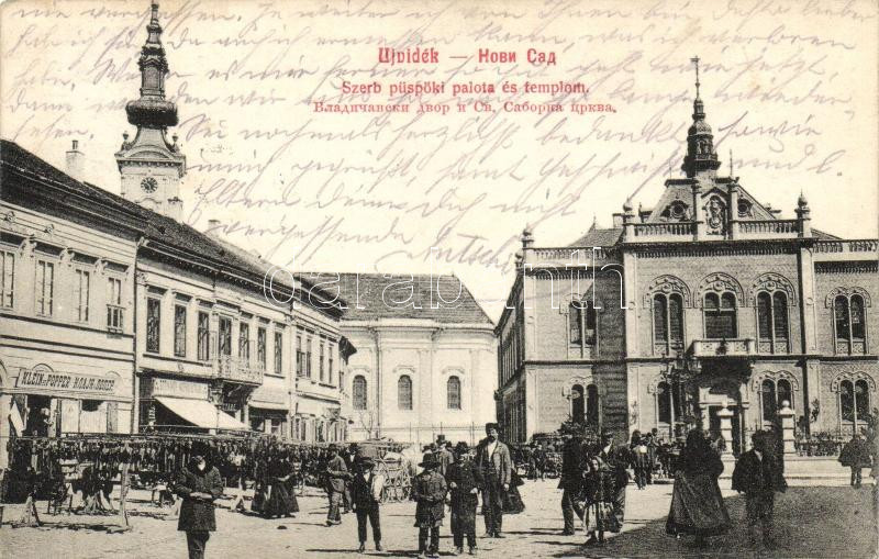 Beschreibung: Újvidék, Novi Sad; Szerb püspöki palota és templom, Klein és Popper és Stein Mór üzlete / Serbian bishop's palace and church, shops