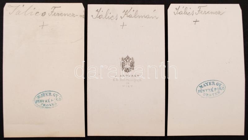 cca 1870 Jálics Ferenc (1795-1874) borkereskedő Pesten és felesége, továbbá gyermekük Jálics Kálmán (1834-1897) szőlőbirtokos, 3 db vizitkártya méretű feliratozott fénykép, 10x5x6 cm