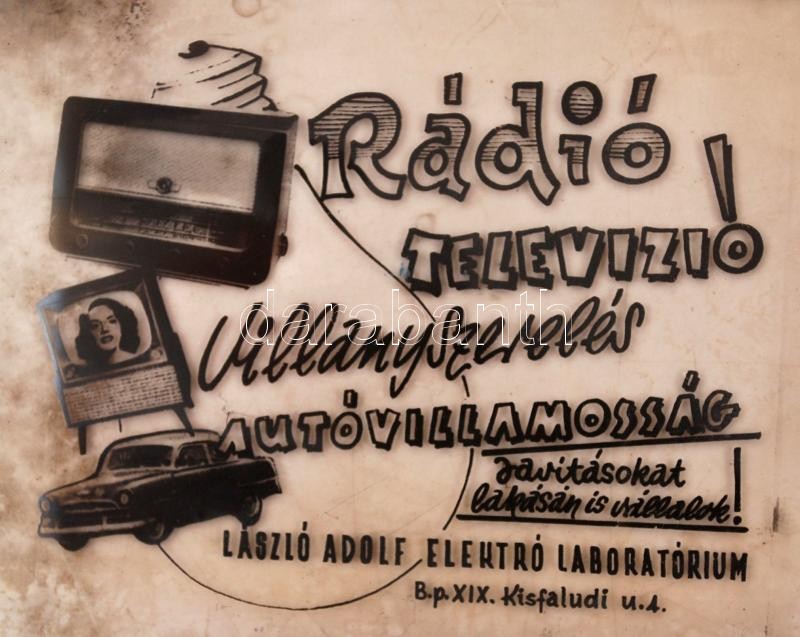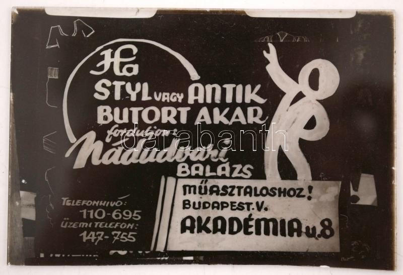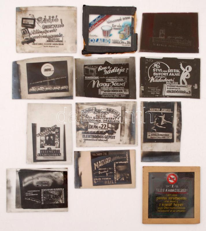 cca 1940-1950 Fekete György (1904-1990) budapesti fényképész specialitása a mozikban nagyfilmek előtt vetített álló diapozitív reklámképek voltak, ez az összeállítás különféle szolgáltatásokkal, árucikkekkel kapcsolatos reklámokat, tájékoztatókat tartalmazza, 12 db üveglemezkép, egy része színezett, 8x8 cm és 6x9 cm közötti méretekben