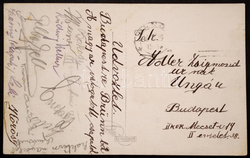 1929 A magyar ökölvívó válogatott által aláírt Adler Zsigmondnak címzett képeslap, többek között Énekes István, Kocsis Antal olimpiai bajnokok és és még sok más saját kezű aláírással