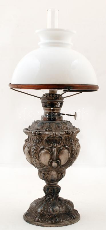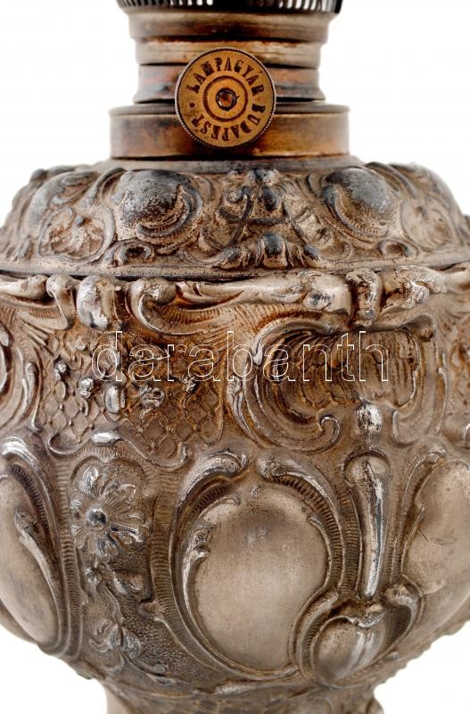 Beschreibung: Lápagyár Budapest, dekoratív fém test, pótolt sérült üvegbúra, jelzett, m:34 cm (búra nélkül)