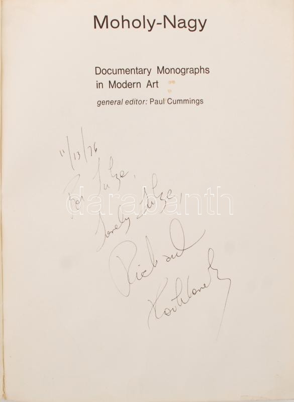 Moholy-Nagy. Szerk.: Kostelanetz, Richard. New York - Washington, 1970, Praeger Publishers (Documentary Monographs in Modern Art). Moholy-Nagy László művészetelméleti tanulmányainak legteljesebb és legtöbbször hivatkozott illusztrált gyűjteménye. A szerkesztő, Richard Kostelanetz, amerikai avantgarde-szakértő, esztéta, művész dedikálásával. Papírkötésben, műanyag védőfóliában, jó állapotban.
