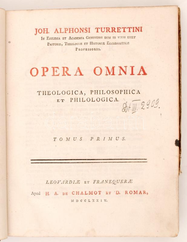 Joh. Alphonsi Turrettini: Opera Omnia Theologica, Philosophica et philologica. Tomus Primus. Leovardiae et Franequaerae, 1774, Chalmot, D. Romar. Viseltes félbőr kötésben.