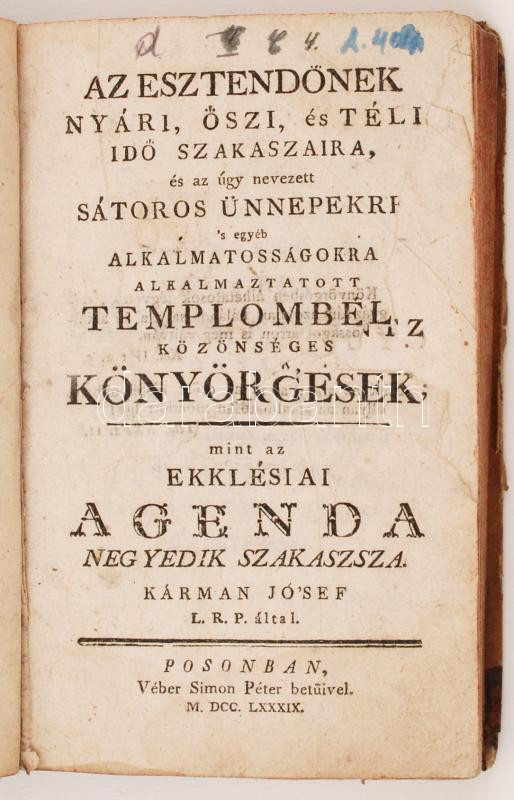 Beschreibung: Kárman Jó'sef: At esztendőknek nyári, öszi, és téli idő szakaszaira, és az úgy nevezett sátoros ünnepekre 's egyéb alkalmatosságokra alkalmaztatott templombeli közönséges könyörgések... IV. kötet. Posonban, 1789, Véber Simon Péter betüivel. Félbőr kötésben, viseltes állapotban.
