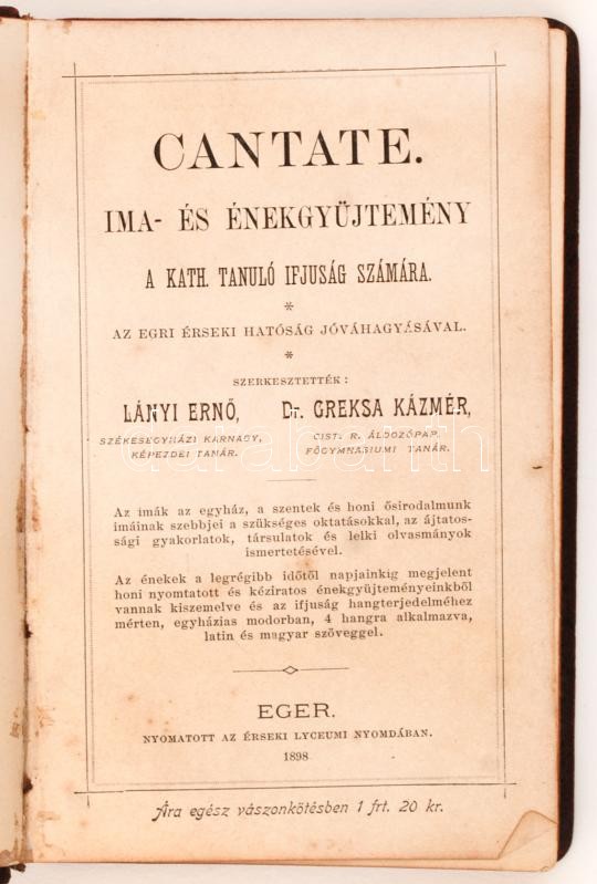 Lányi Ernő, Greksa Kázmér dr.: Cantate. Ima- és Énekgyűjtemény. Eger, ... https://www.darabanth.com/de/230-Fernauktion/230.0/Andere-Sammelgebiete/Bucher-Religion~200023/Lanyi-Erno-Greksa-Kazmer-dr-Cantate-Ima-es-Enekgyujtemeny-Eger-1898-Erseki-Lyceumi-~II1033366