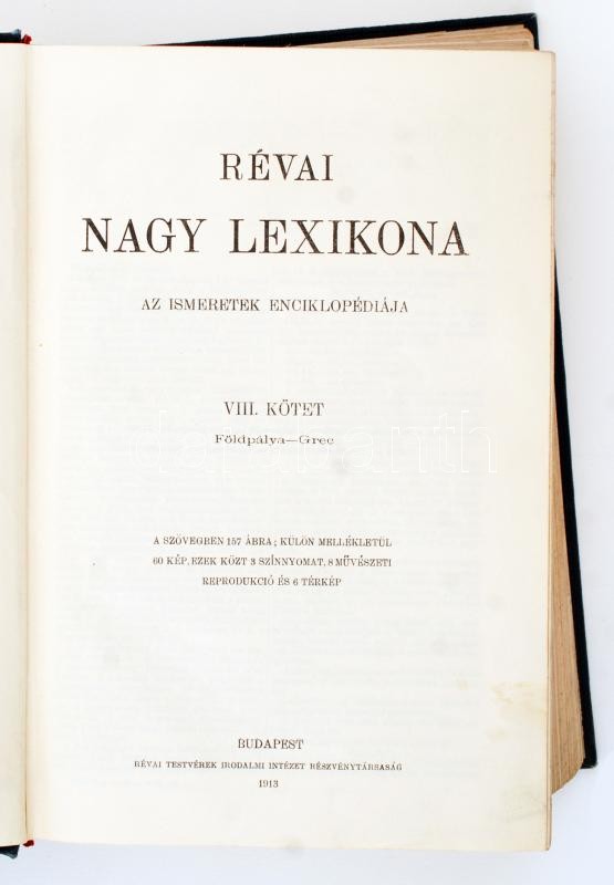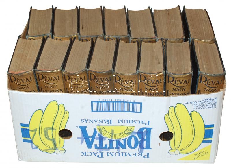 Révai nagy lexikona. 1-15. köt. Bp., 1911-1922, Révai Irodalmi Intézet. Dombornyomott, gazdagon díszített vászonkötésben, az egyes kötetek gerince kicsit kopott, kötetenként változó, nagyrészt jó állapotban.